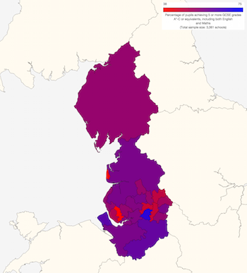 In this light it is perhaps worth reminding ourselves that it is decidedly not all grim up north (or all sweetness and light down south). Just look at this map of individual school GCSE performance in the North West: