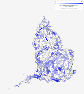 Map 1 (below left) shows the proportions of primary schools in England that are faith schools of any kind (each coloured area is a parliamentary constituency). The highest concentrations of faith schools tend to lie in a line than runs down the western side of the country, from Cumbria in the north to Dorset in the south. However, this view obscures the urban areas where most schools are located. To correct this, Map 2 (below right) scales each constituency based on the number of pupils who go to school there. This more clearly reveals that faith-based primary schools tend to be located in the areas outside major urban centres such as London and Birmingham, as well as in the North West. (Click on these maps or any of the others that follow to be taken to larger interactive versions.)